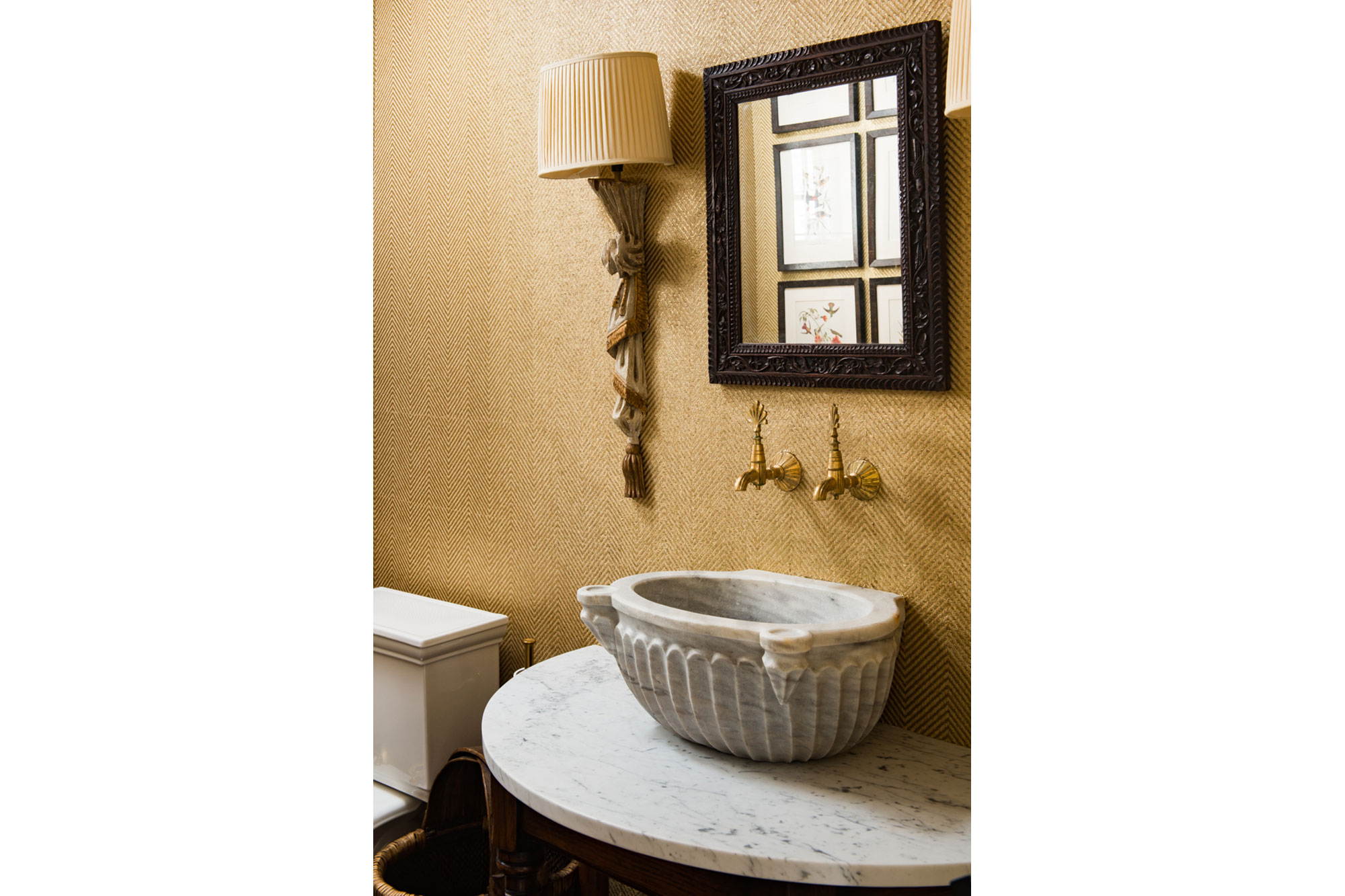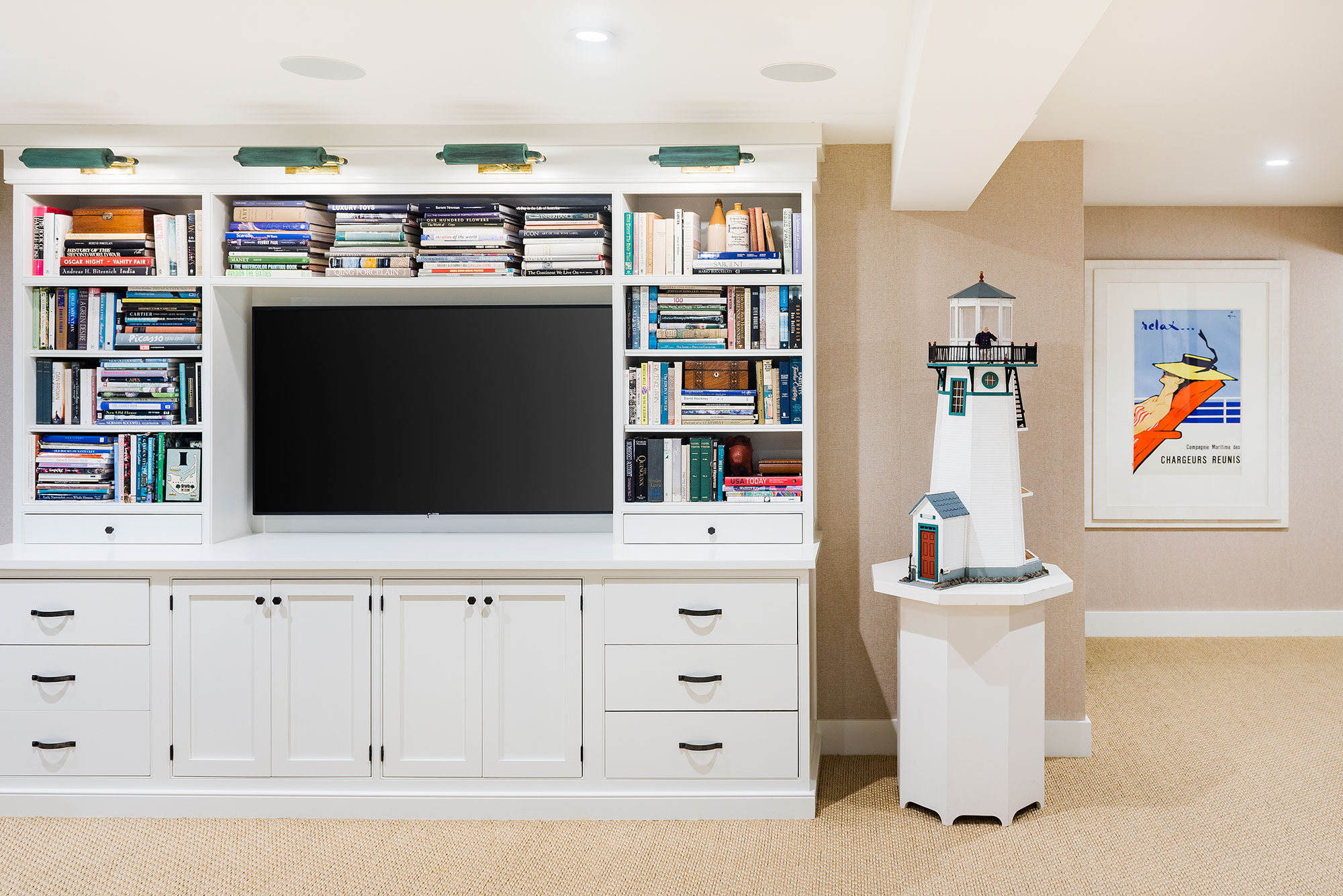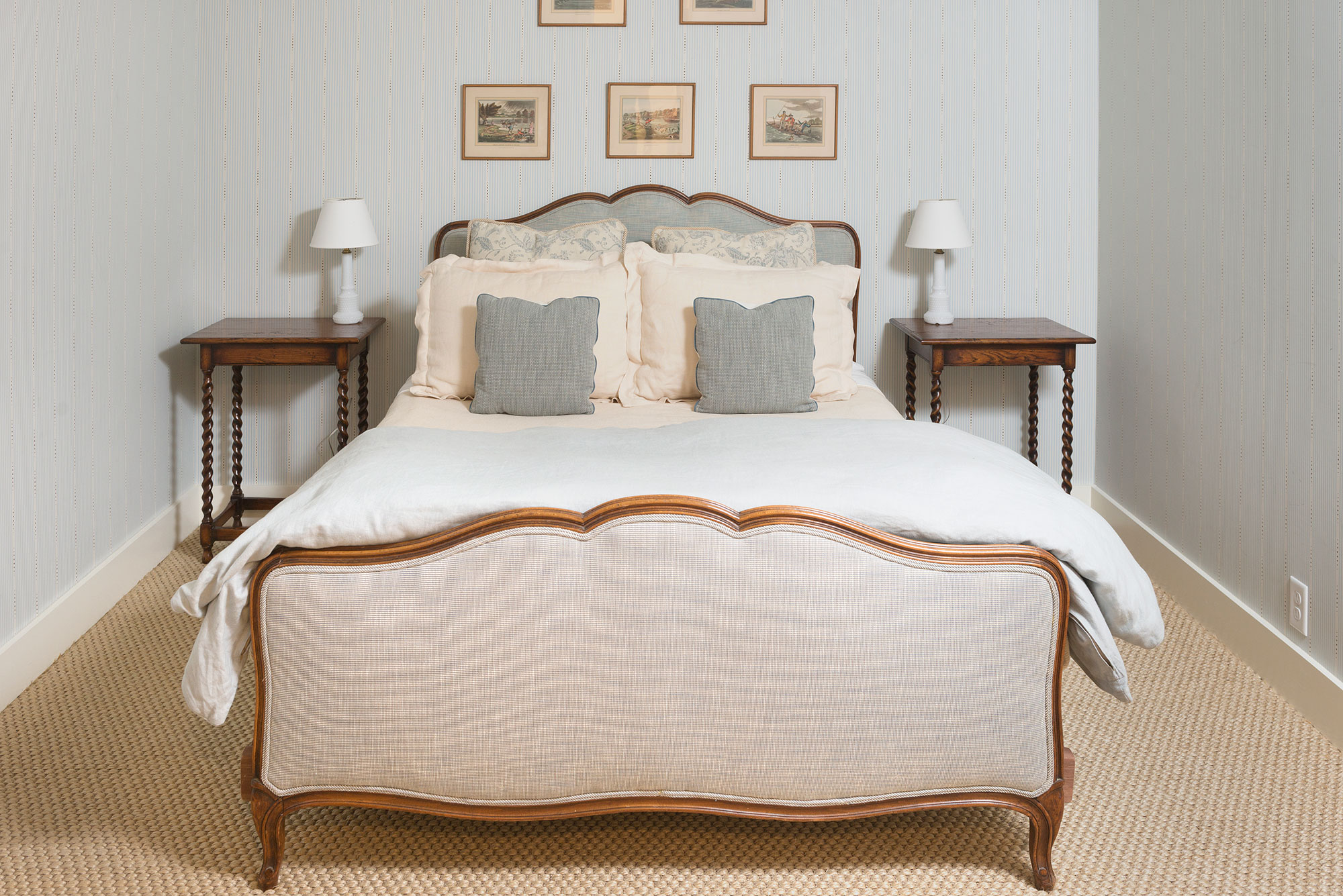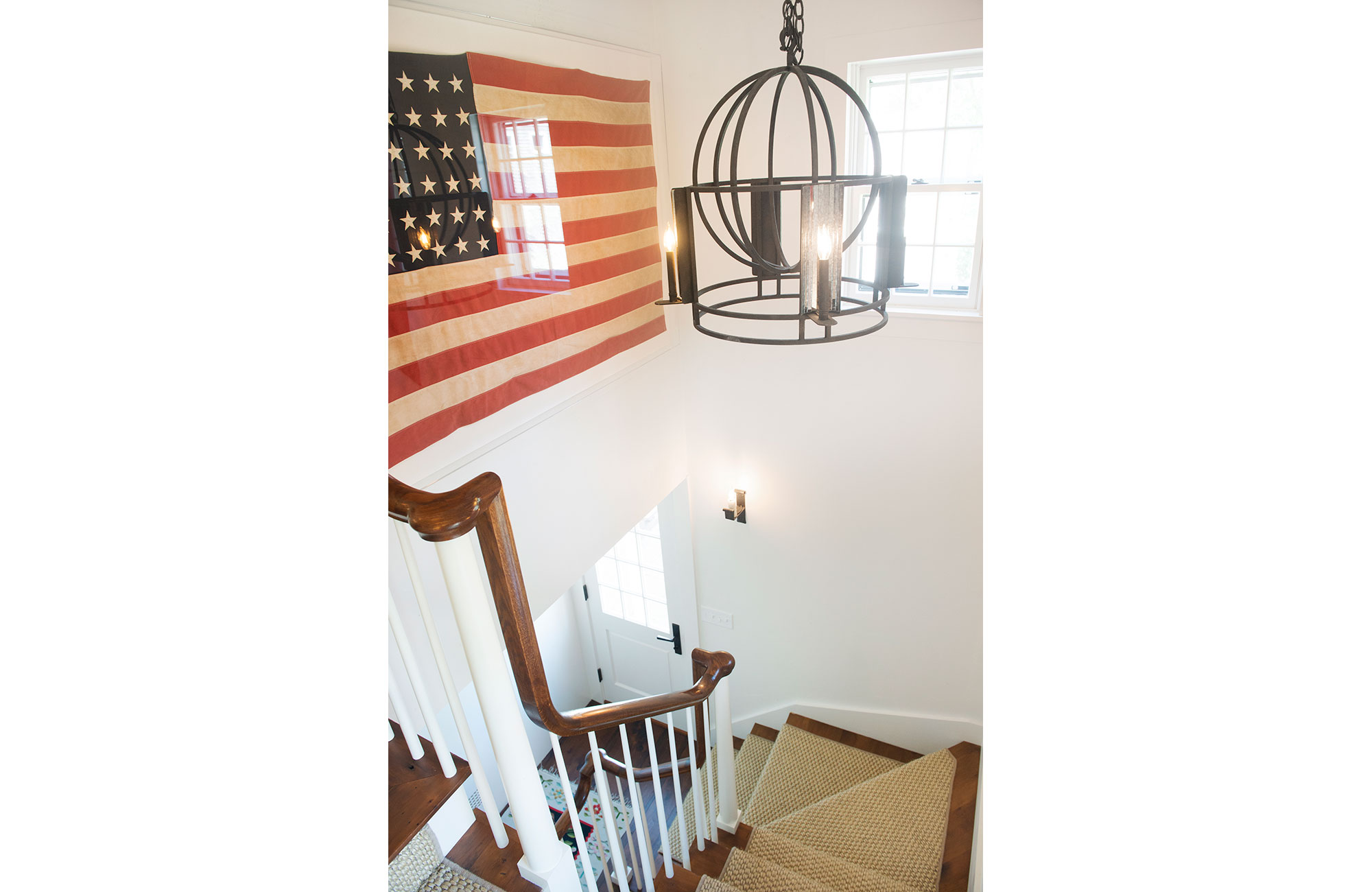 Continuing towards the back of the first floor one finds the chef’s kitchen and a mudroom. Just off the kitchen is the family room which has seating for dining, a powder room, television, and a fireplace. Double doors in the family room lead to an furnished outdoor patio, and a gas grill. The screened-in porch off the family room serves as another seating and dining option. To the side of the house is a large lawn and landscaped yard.