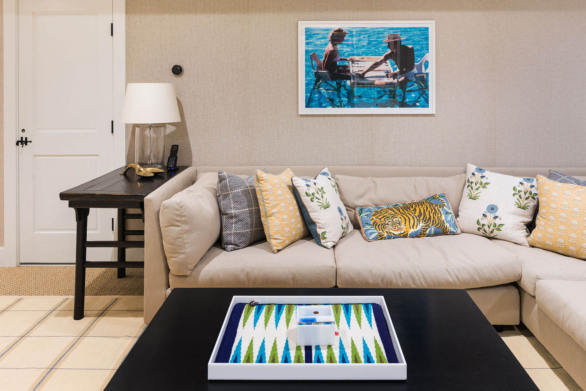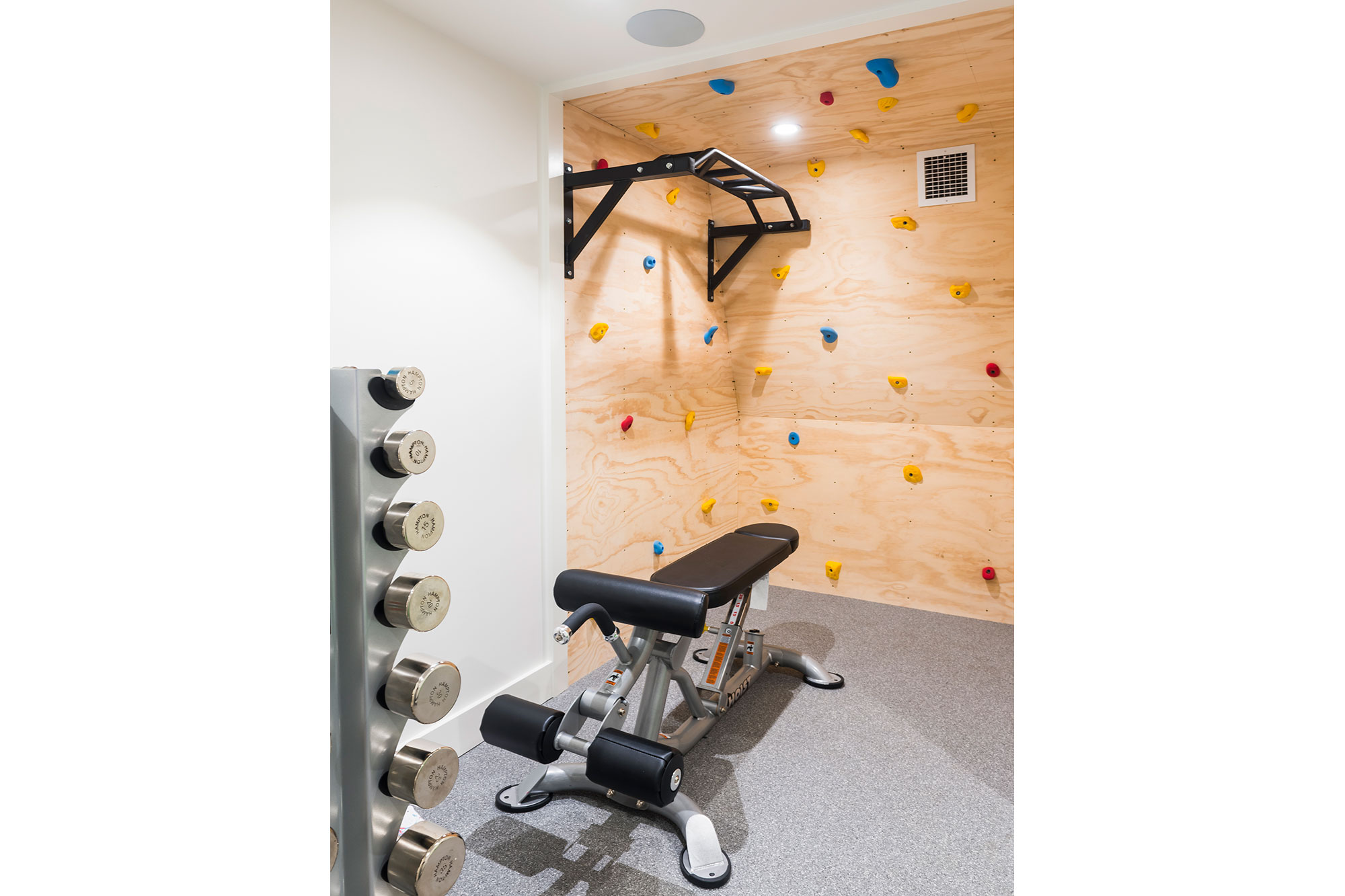 Upon entering the lower level, the den with shuffleboard, television, games, and books awaits. Directly off of the den is the home gym with a treadmill, weights, and a climbing wall for the kids. Heading through the den towards more living space is guest bed three which includes full en suite bath and queen sized bed.