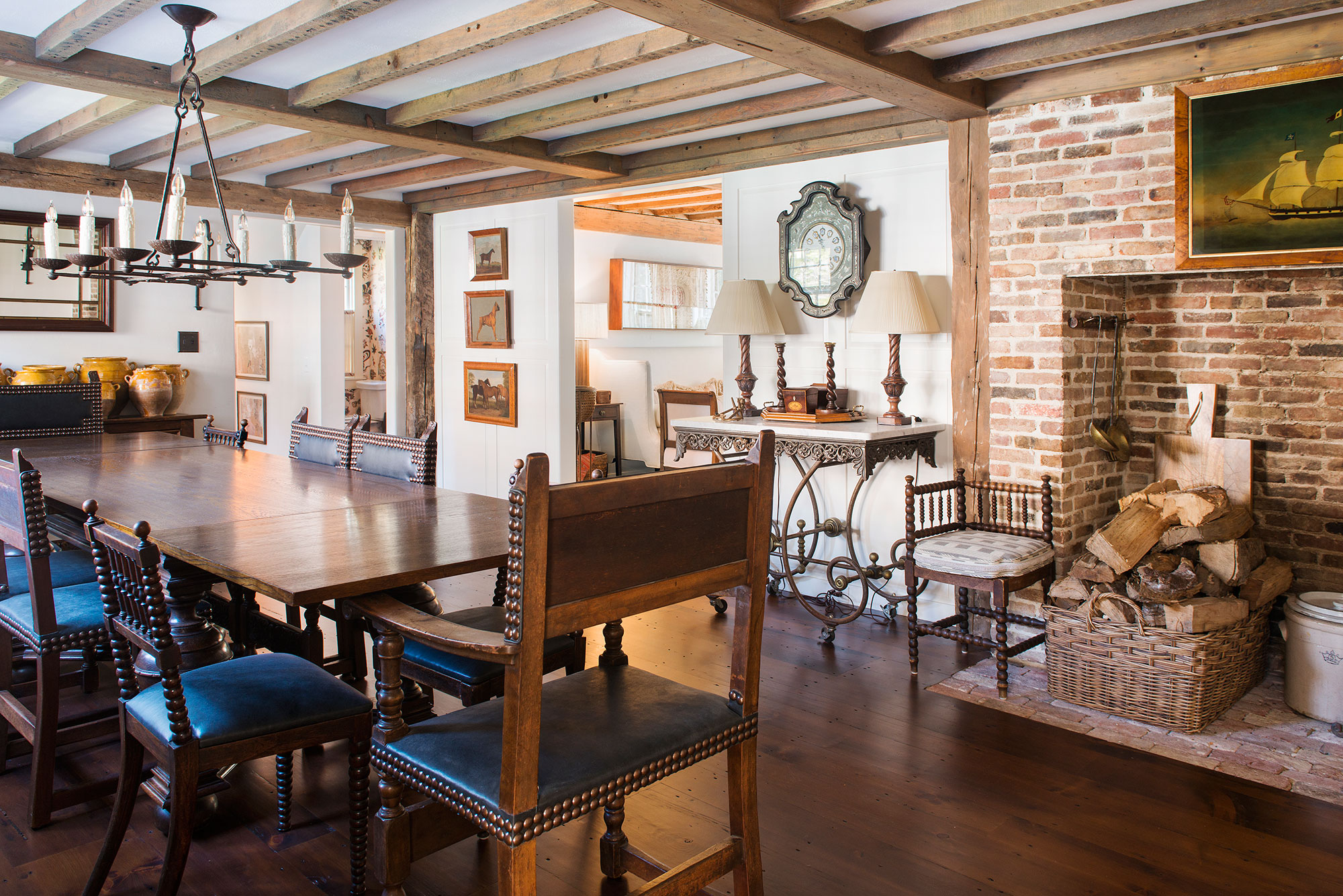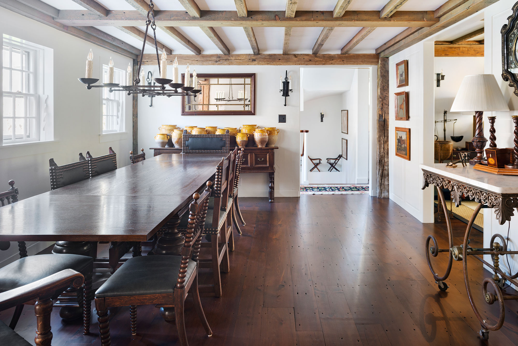 The first floor main entryway leads into the living room with a guest bed adjacent there to. Guest bed one has a king size bed and a full bath ensuite. Connecting to the living room is an open layout dining room with an expansive table that seats fourteen people. Next to the stairs heading towards the lower level is the office/library and a powder room.